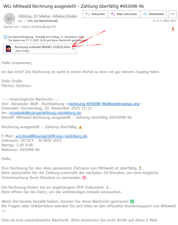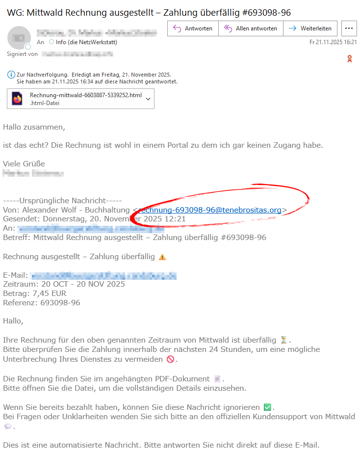 Ein misstrauischer Kunde fragte (zum Glück) bei uns nach, ob eine Rechnung, die ihm von Mittwald überstellt wurde, echt sei. Sein Glück, wir konnten ihn vor sog. Phishing bewahren.